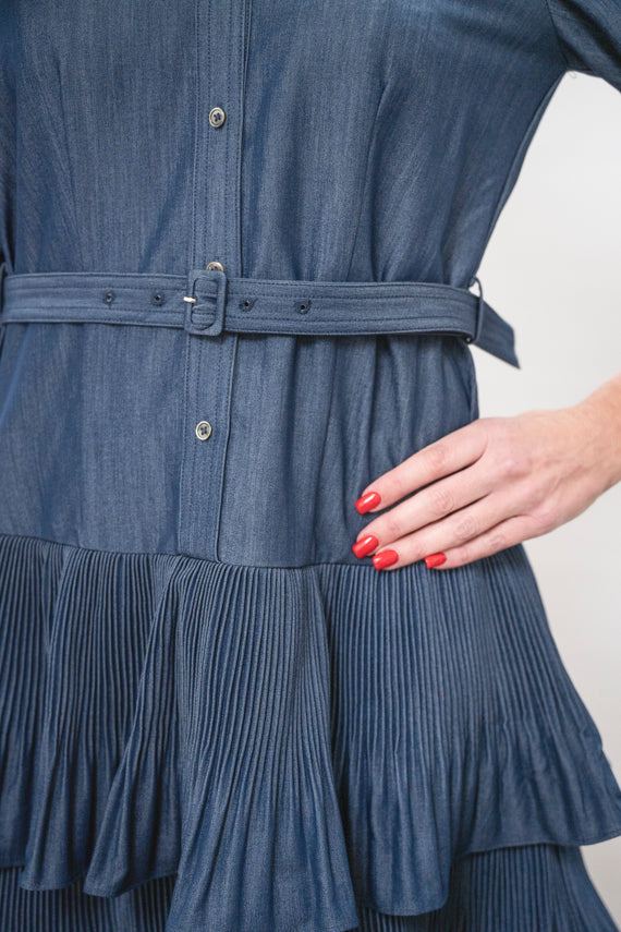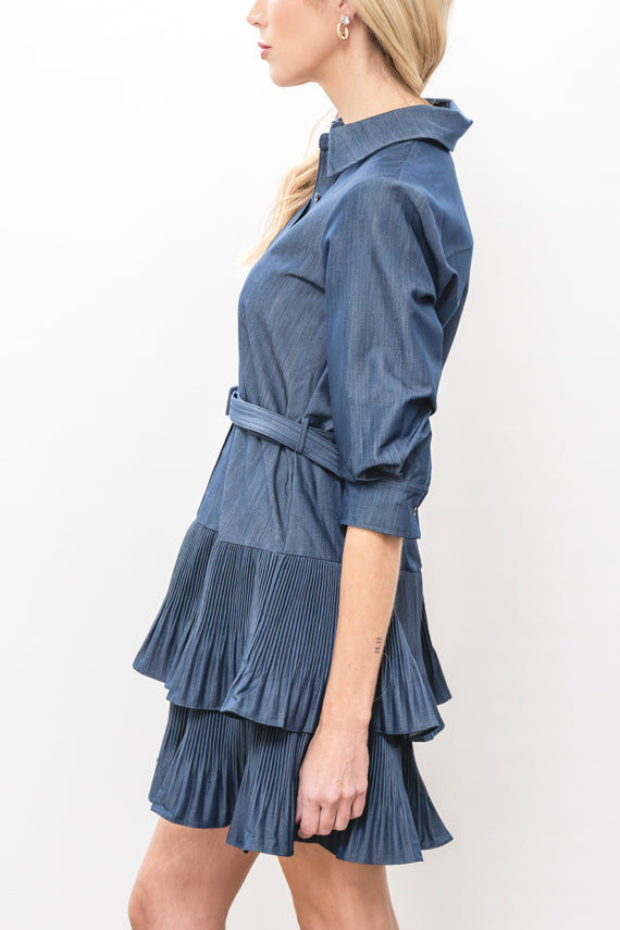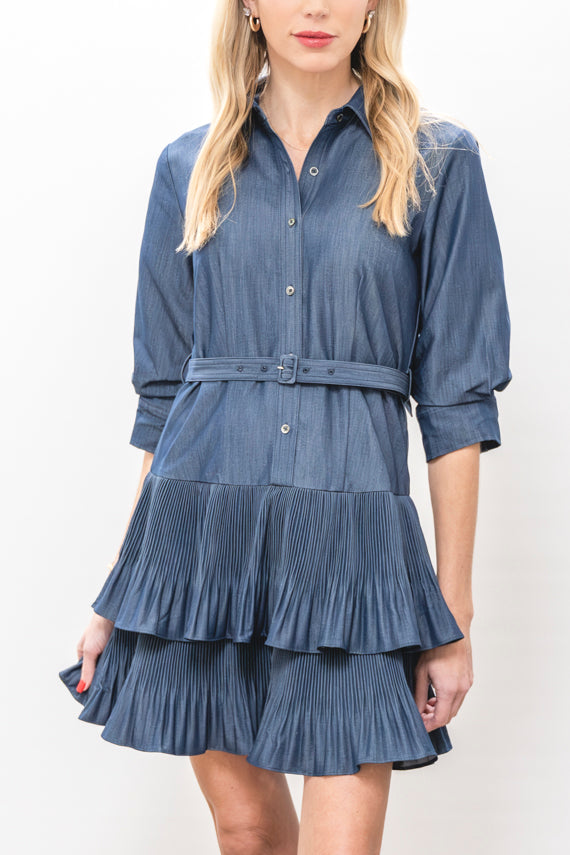 Effortlessly chic and versatile, this button-up pleated skirt mini dress combines timeless style with modern comfort. Crafted from quality blended materials, it features a classic collared neckline and three-quarter sleeves perfect for layering or wearing solo. The pleated skirt adds graceful movement and dimension, while the button front allows easy styling adjustments. An included belt lets you cinch the waist for a customized fit that flatters your silhouette. Whether you're dressing up for work or down for weekend adventures, this dress transitions seamlessly from day to night.