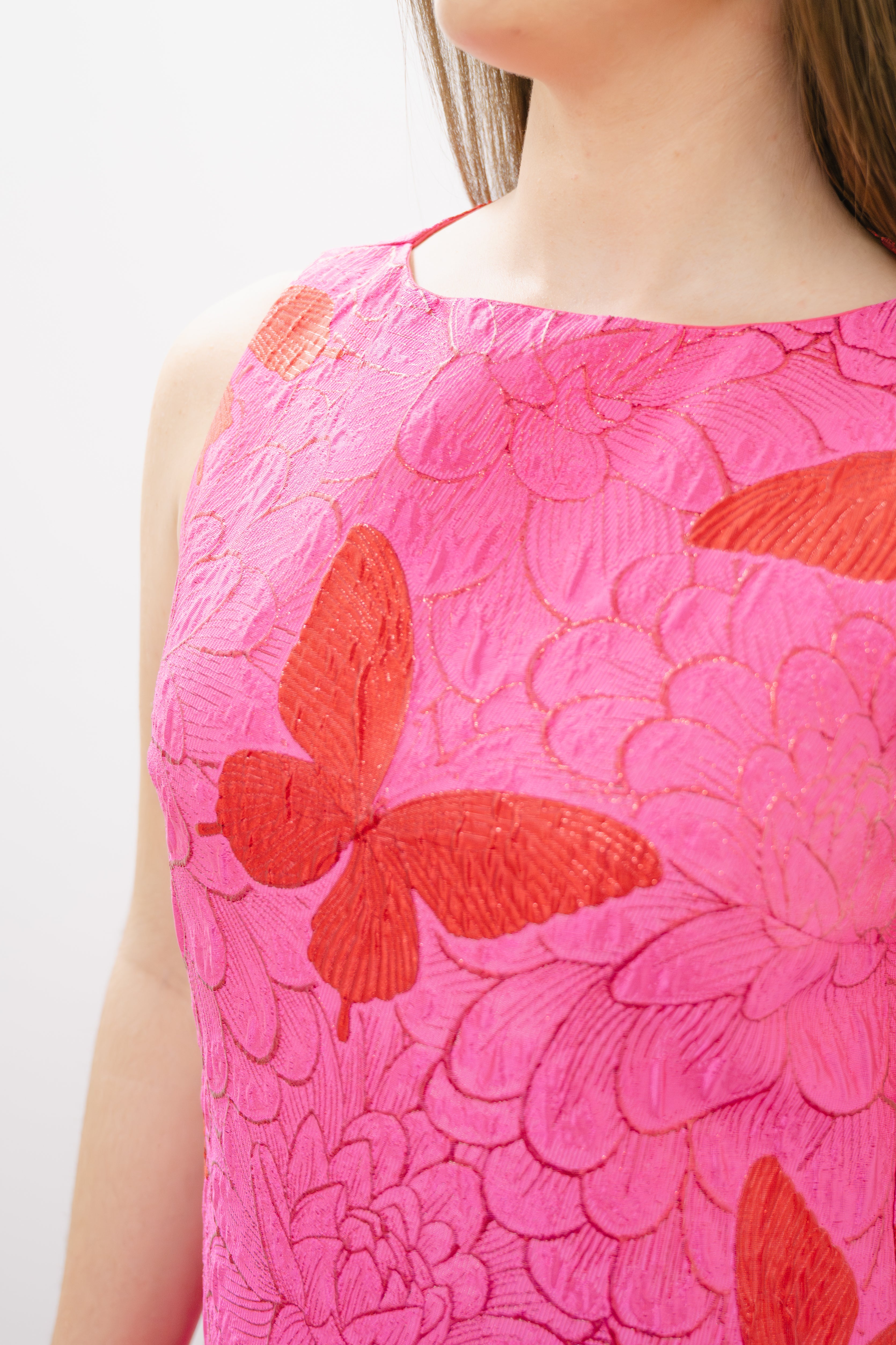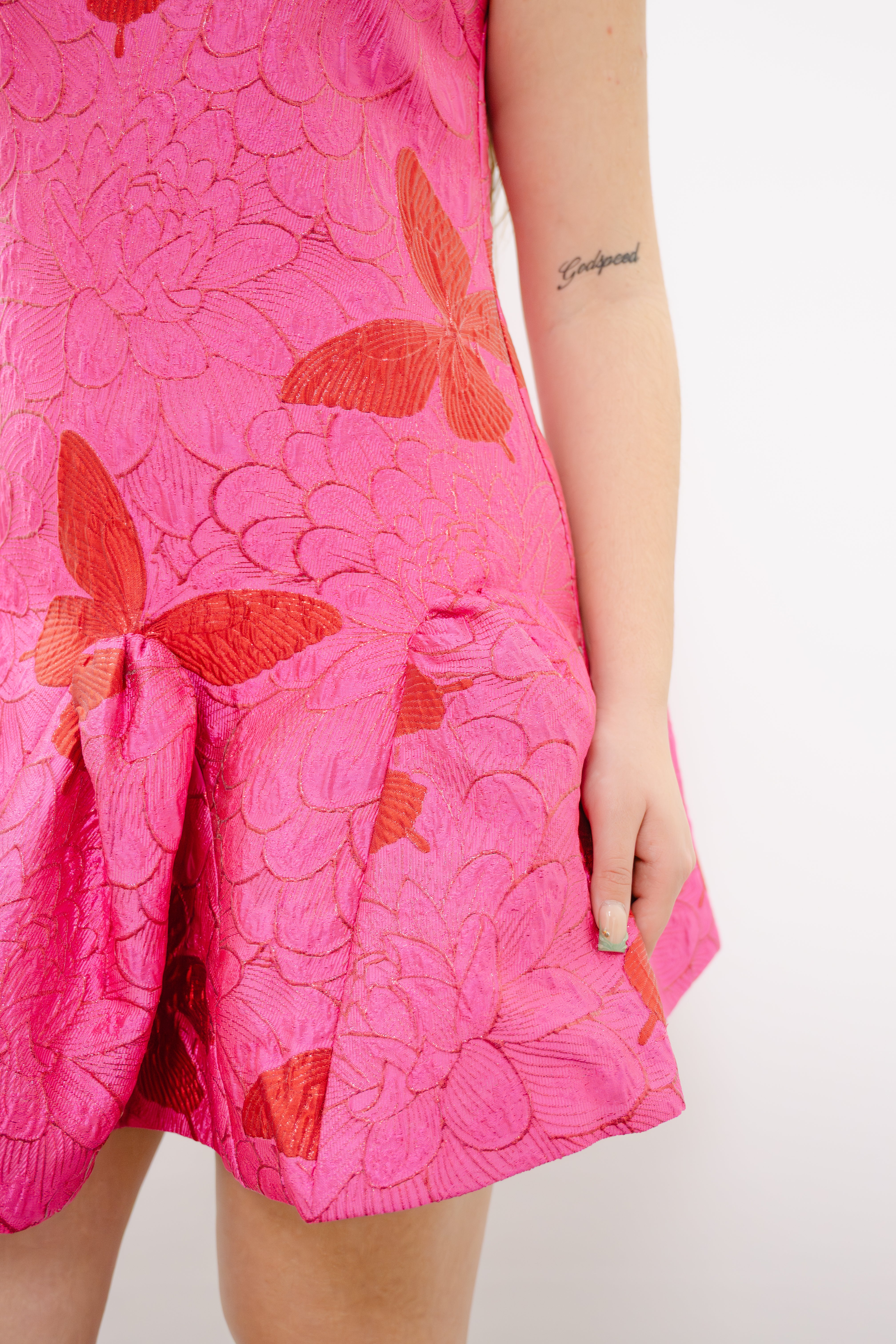 The ELLIATT Lorena Mini Dress is a stunning sleeveless design featuring delicate pink and red butterfly motifs that dance across blended materials. This bubble dress silhouette creates a playful, feminine shape with a flattering fit. The back zipper closure adds an elegant finishing touch while ensuring easy wear. Perfect for making a bold statement at any occasion, this dress combines whimsical style with modern sophistication.