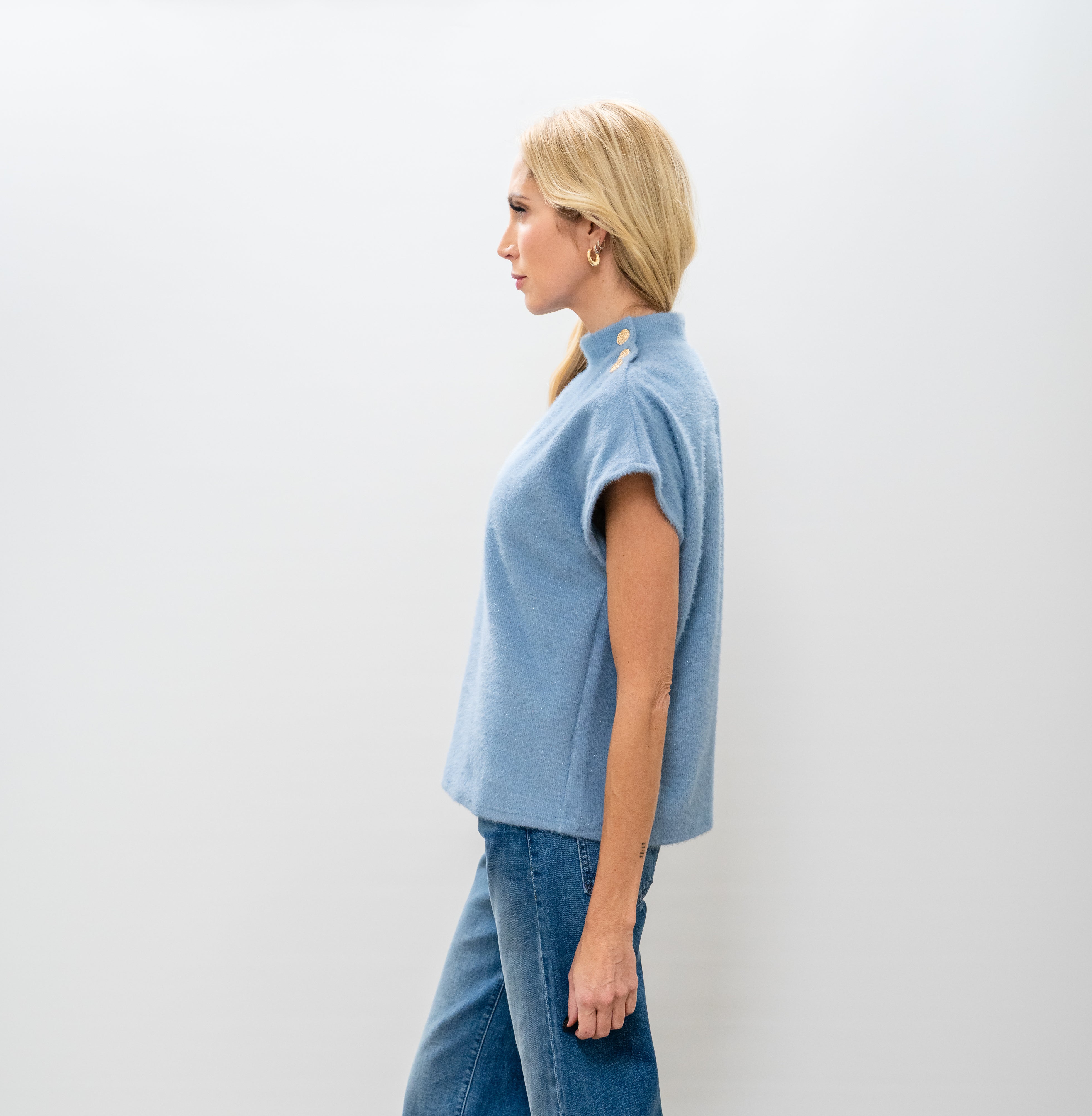 Elevate your everyday style with this luxurious THML Button Collar Sweater Top. Crafted from blended materials for the perfect balance of comfort and durability, this piece features a chic mock neck and short sleeves ideal for layering or wearing solo. The standout button collar with gleaming gold buttons adds instant sophistication, while the fuzzy texture brings cozy warmth and tactile appeal. Perfect for transitional weather, this versatile top effortlessly bridges casual and polished looks, making it a must-have addition to your wardrobe.