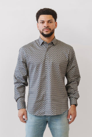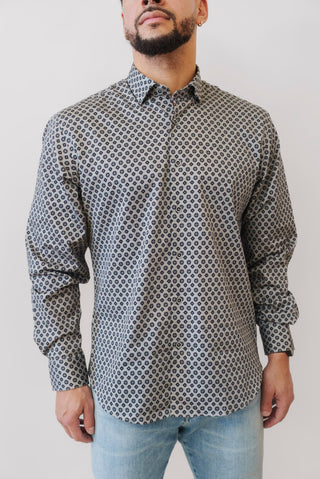 Expertly designed, the MIZUMI Shirt combines a sleek dot and star pattern with a versatile grey and black color palette. The long sleeve, collared design offers a sophisticated and professional look, while the button up closure adds a touch of convenience. Elevate your wardrobe with this modern and stylish shirt.