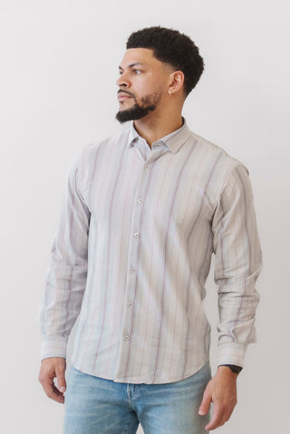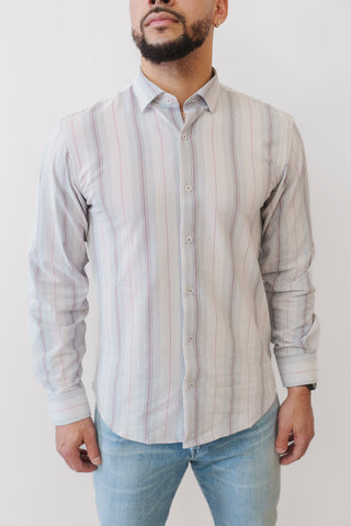Introducing the MIZUMI Shirt in gray, a stylish addition to your wardrobe. This collared shirt features long sleeves and a classic button down design. The red, blue, and white color scheme adds a touch of sophistication to any look. Upgrade your style with the MIZUMI Shirt.
