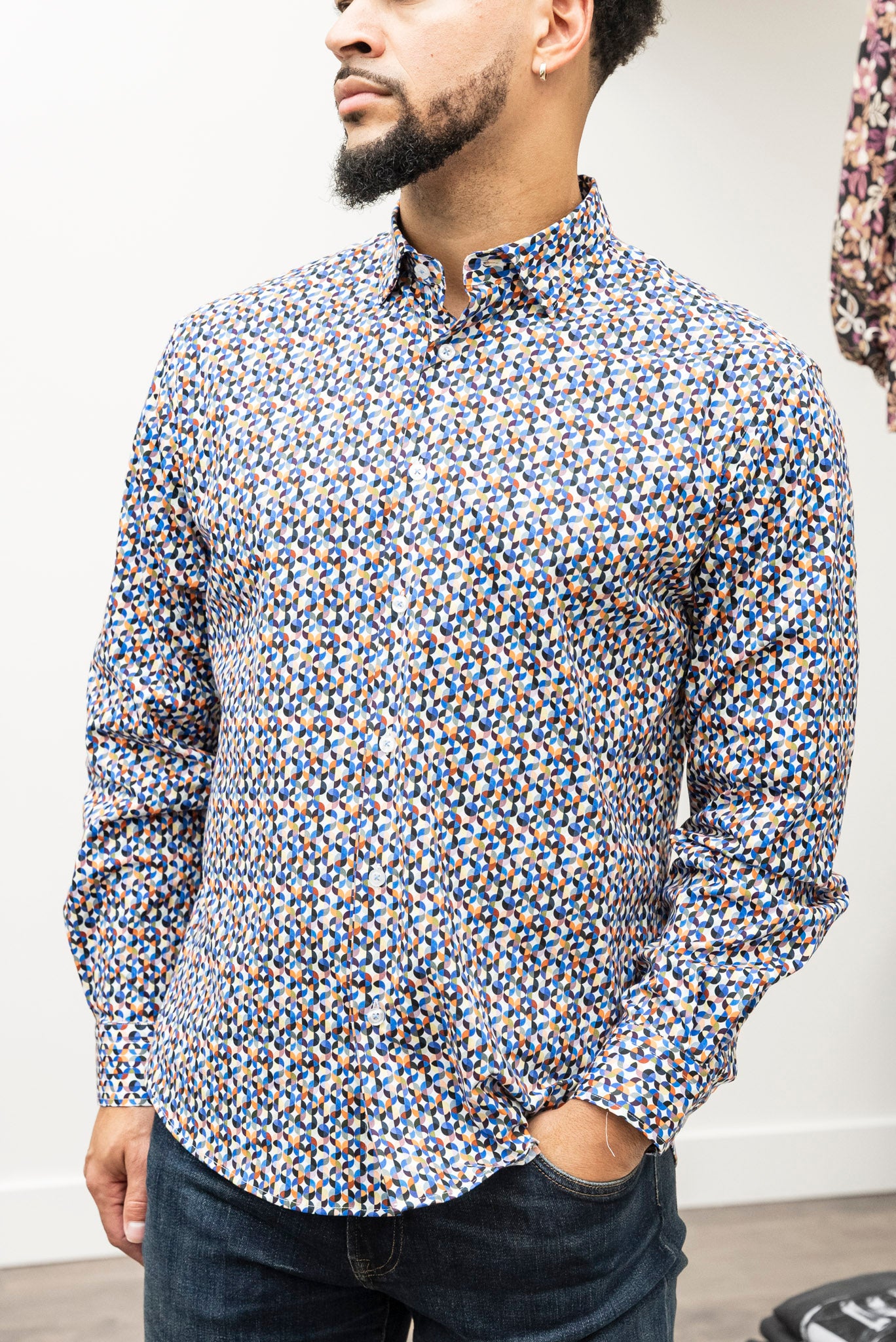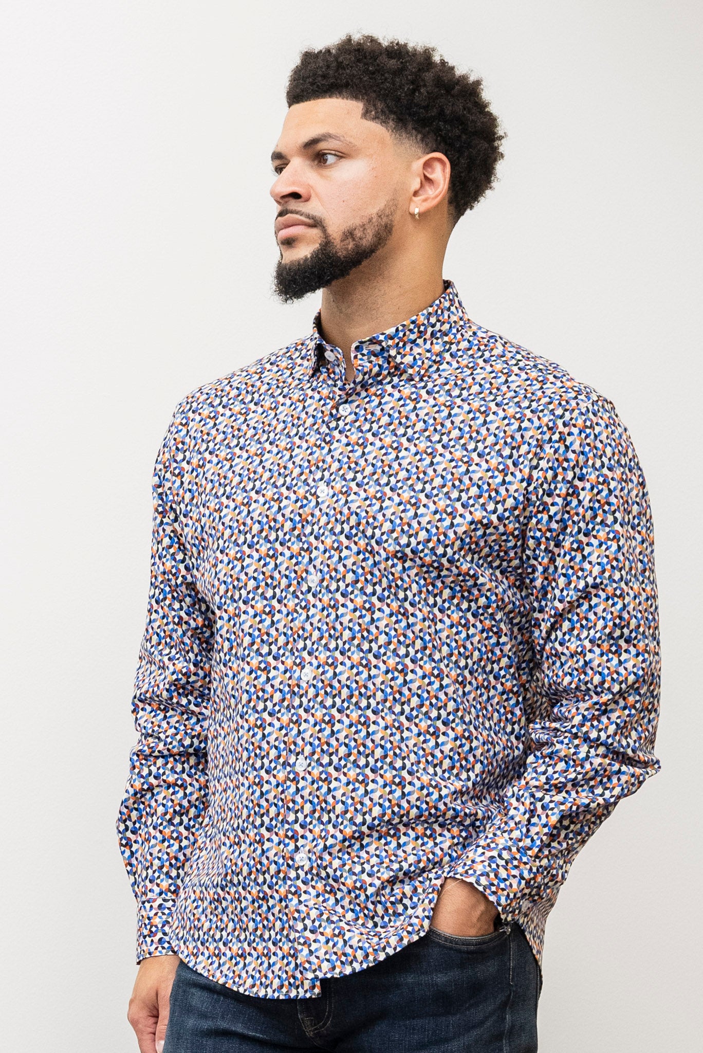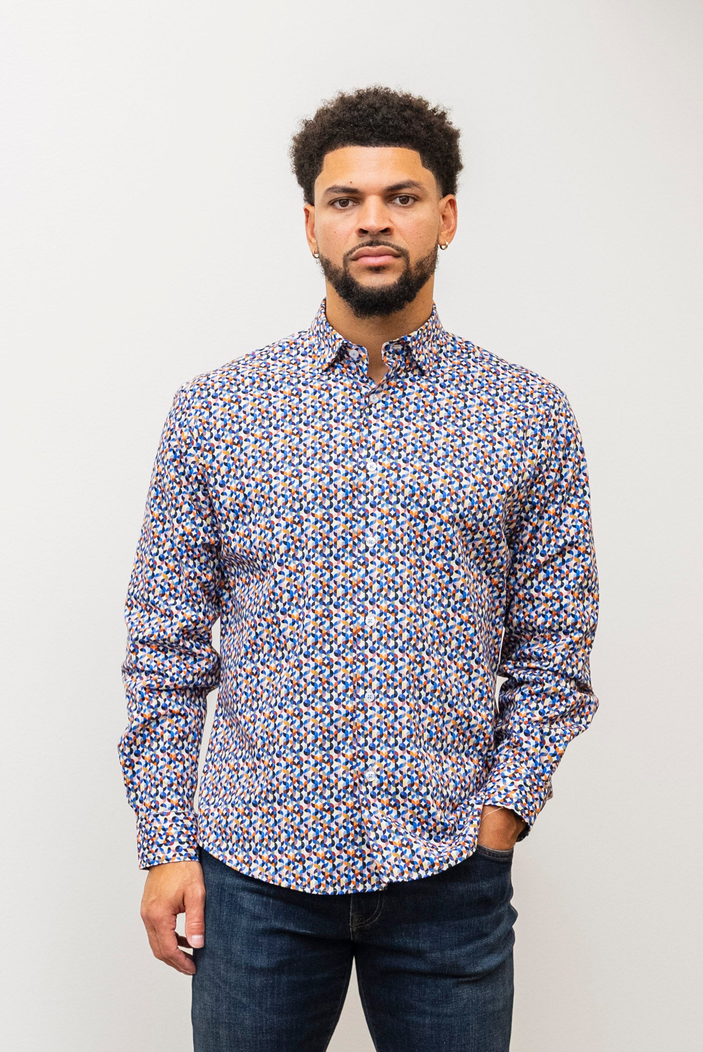The MIZUMI Button Up Multi showcases a vibrant multicolored pattern with eye-catching hints of blue, yellow, orange, and black. Made from lightweight blended materials, it features a classic collared neck, cuffed sleeves, and a button-front design for a polished yet comfortable fit. This versatile shirt adds a fresh pop of color to any wardrobe while keeping you cool and stylish all day long.
