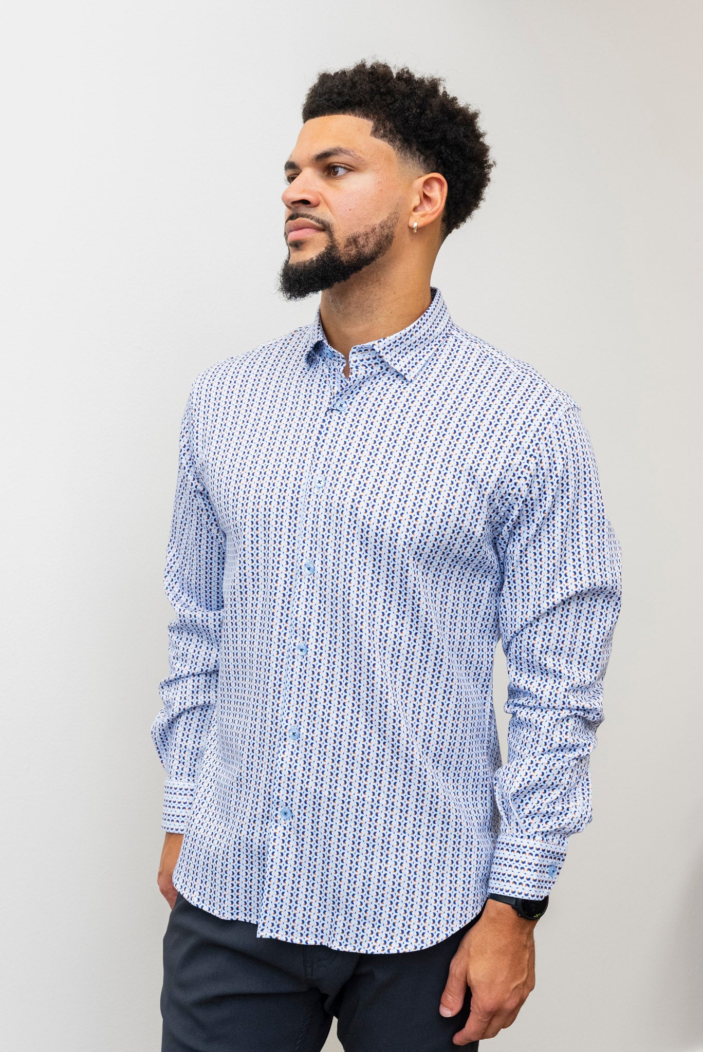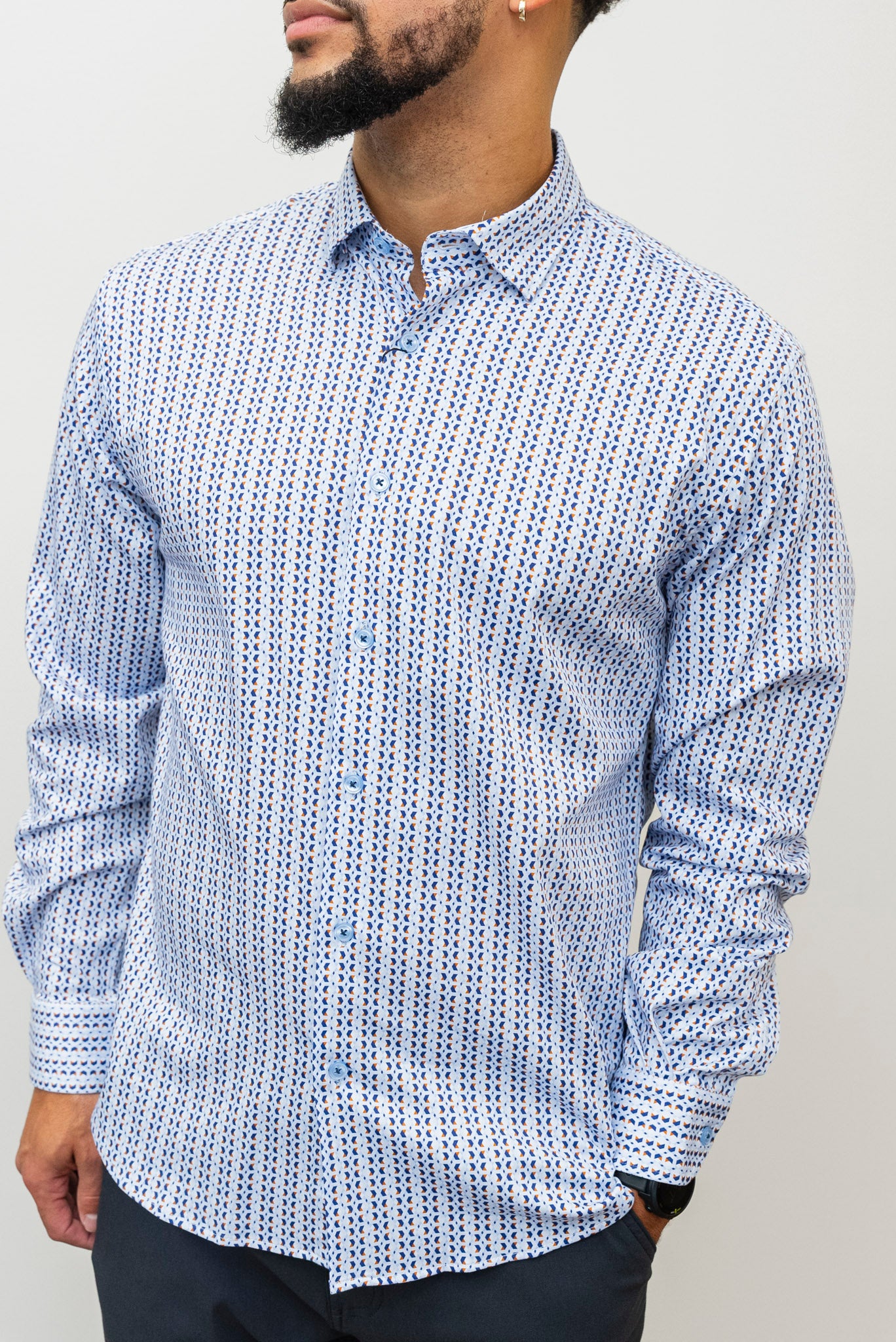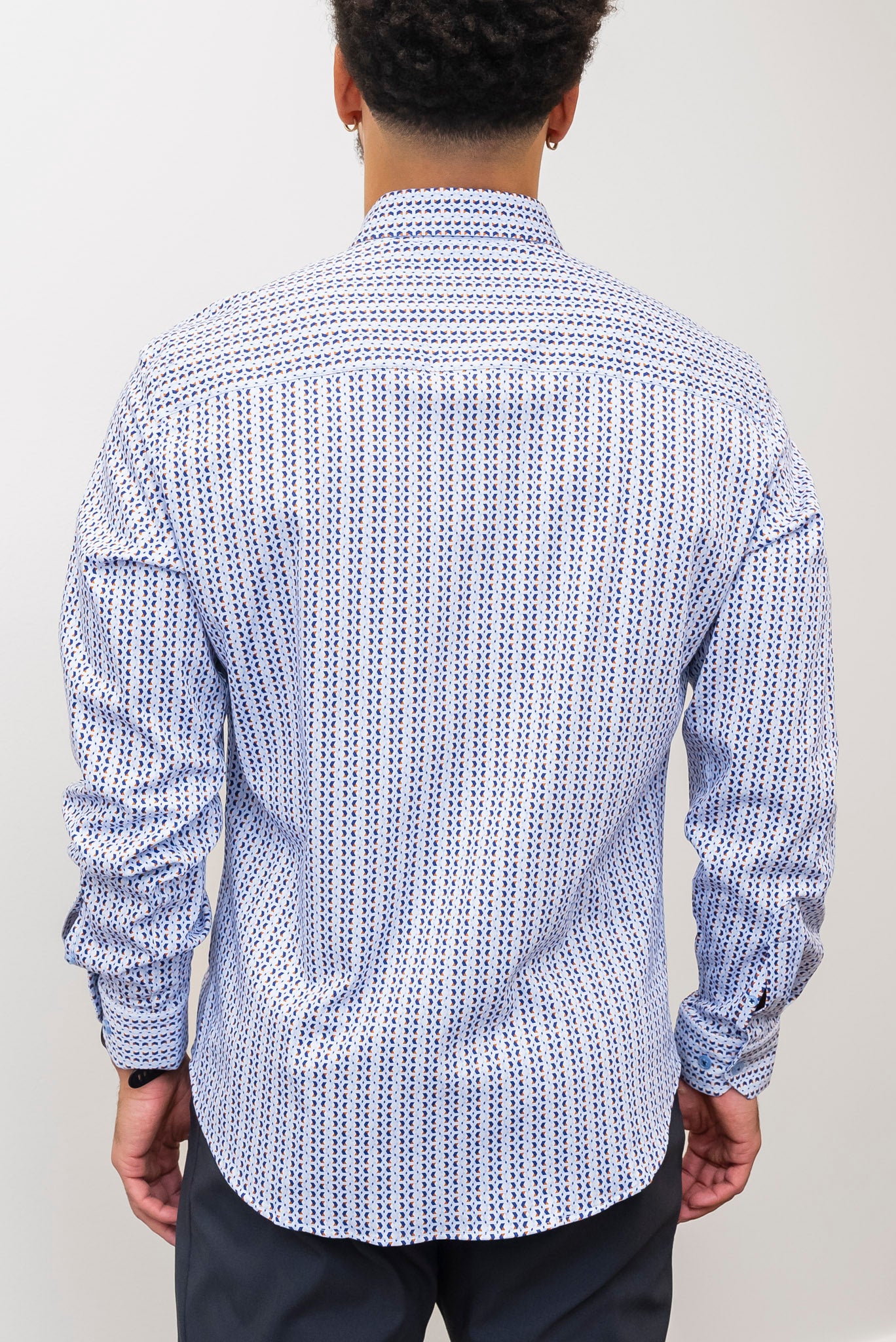 Elevate your wardrobe with the MIZUMI Button Up Blue, featuring a vibrant multicolored geometric pattern that adds a fresh, modern touch. Crafted from blended materials, this shirt offers both comfort and durability. The collared neck and button-front design deliver a polished look, while cuffed sleeves provide a stylish finish perfect for any occasion. Make a statement effortlessly with this versatile, eye-catching piece.