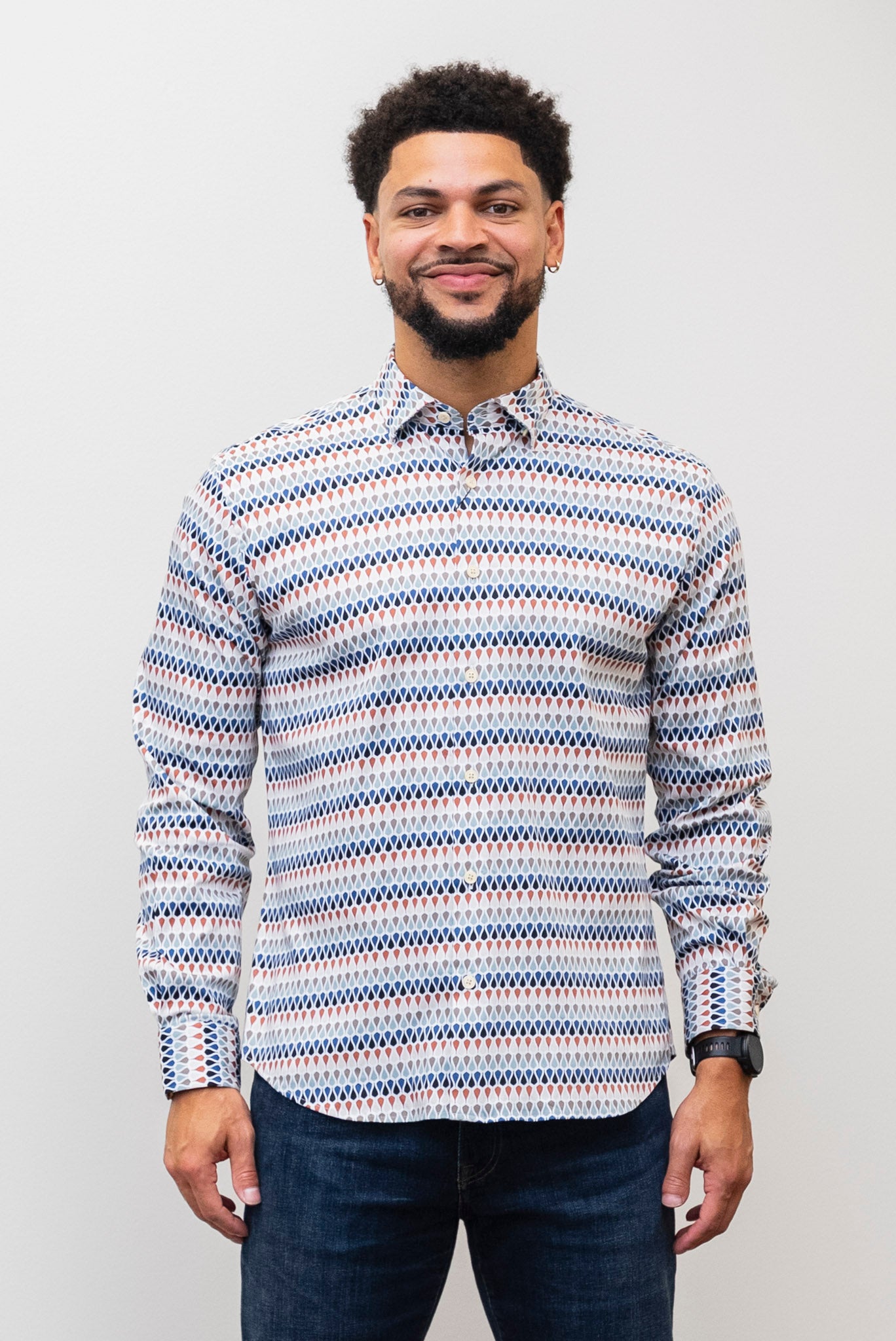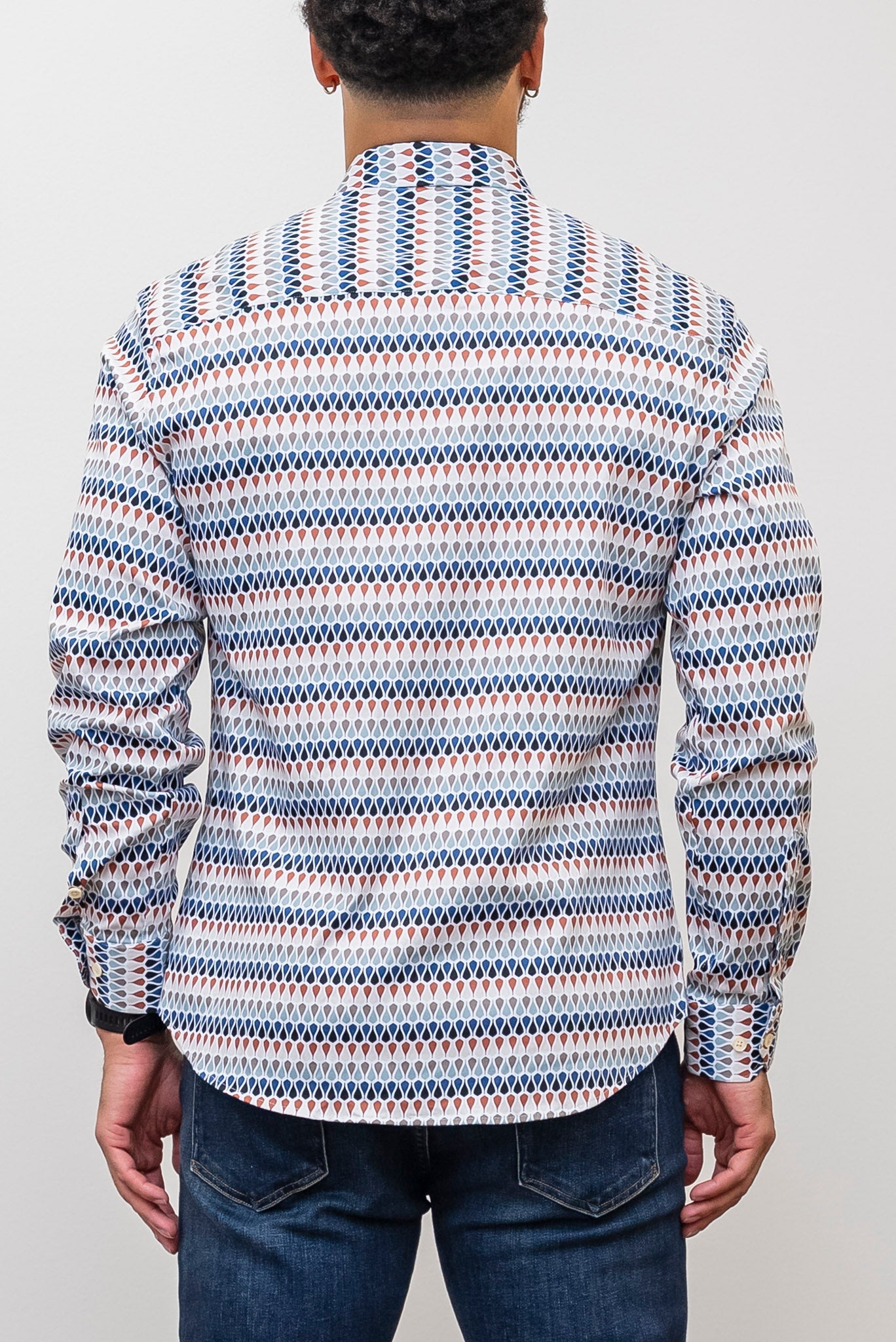 The MIZUMI Button Up Multi offers a vibrant multicolored pattern with striking hints of blue and pops of dark orange. Crafted from lightweight blended materials, it features a classic collared neck and button-front design for a polished yet comfortable look. Perfect for adding a fresh, eye-catching touch to any outfit while keeping you cool and stylish throughout the day.