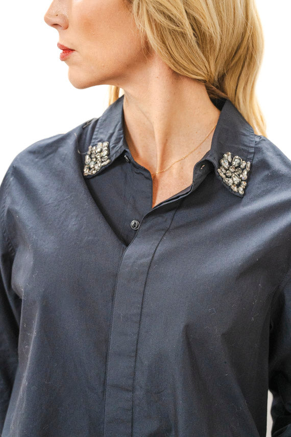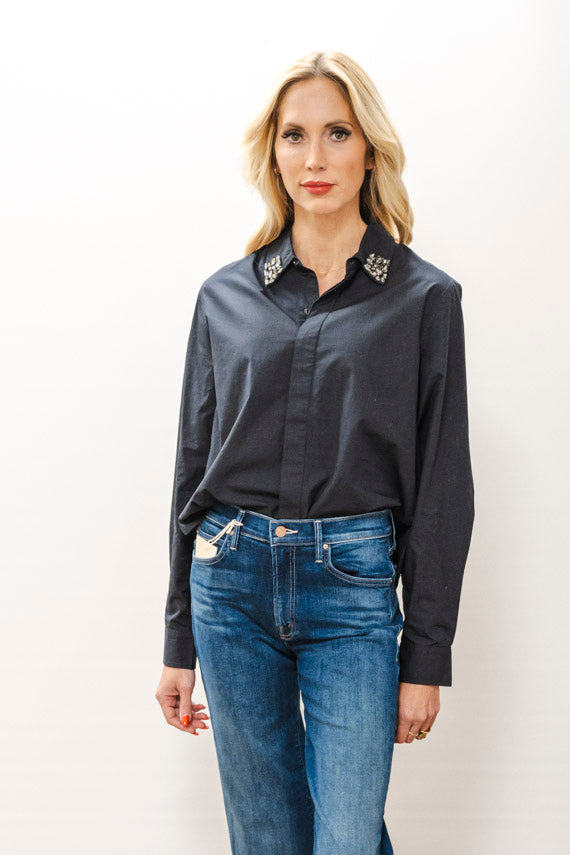 The MOTHER Honor Blouse combines timeless elegance with eye-catching details. Crafted from 100% cotton for breathable comfort and all-day wearability, this blouse features a stunning embellished collar adorned with shimmering gemstones and rhinestones that instantly elevate any outfit. The classic button-front design offers effortless styling versatility, making it perfect for dressing up casual looks or adding polish to your everyday wardrobe. Whether you're heading to brunch or a special occasion, this sophisticated piece delivers both comfort and glamour in one stunning package.