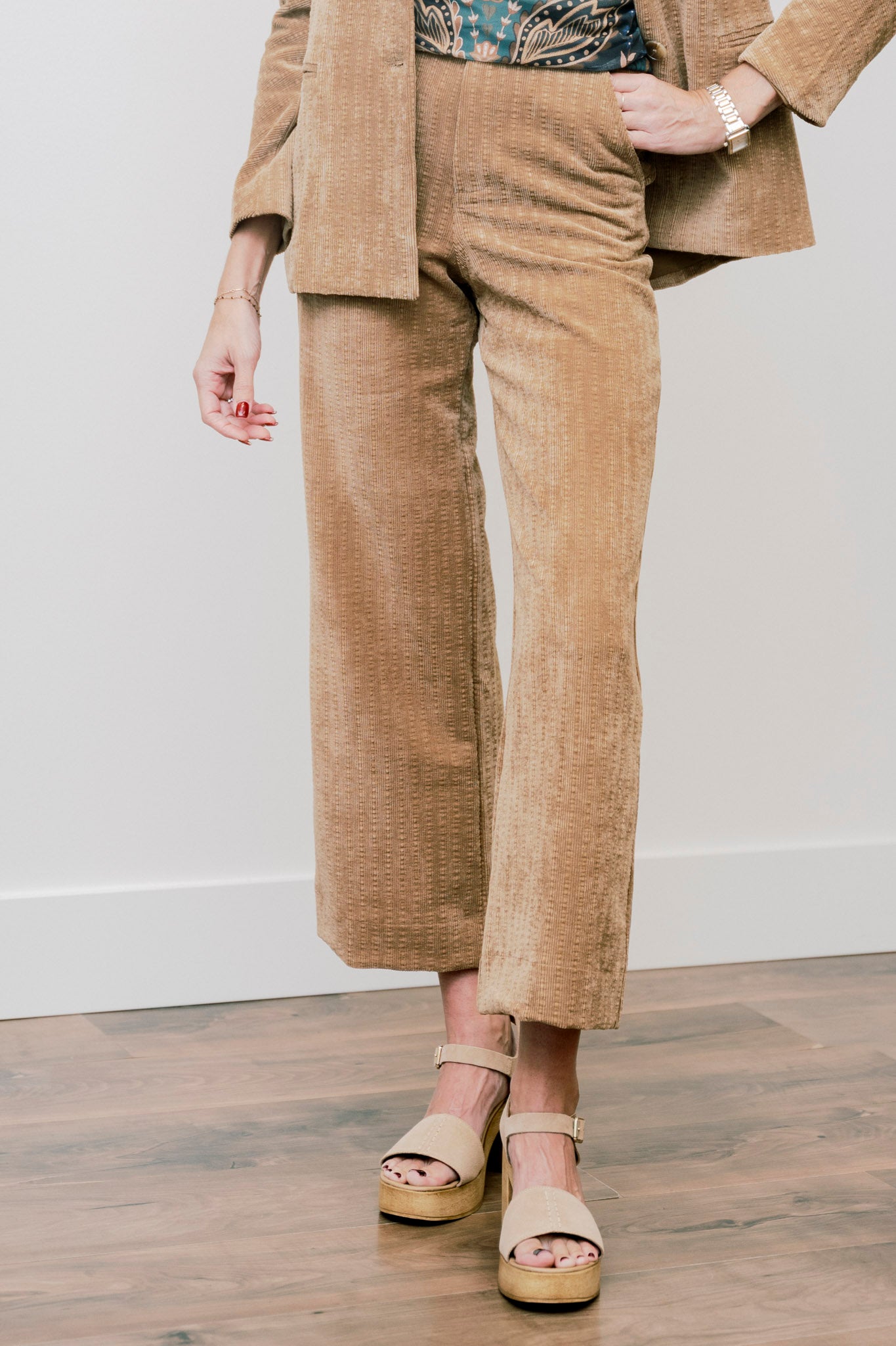 Crafted from a comfortable blended medium-weight material, the CURRENT AIR Corduroy Cropped Flare Pants combine style and function with practical pockets. Their tailored flare silhouette adds a modern touch, while perfectly complementing the CURRENT AIR Corduroy Jacket for a stylish and cohesive outfit. Elevate your wardrobe with these versatile, must-have pants.