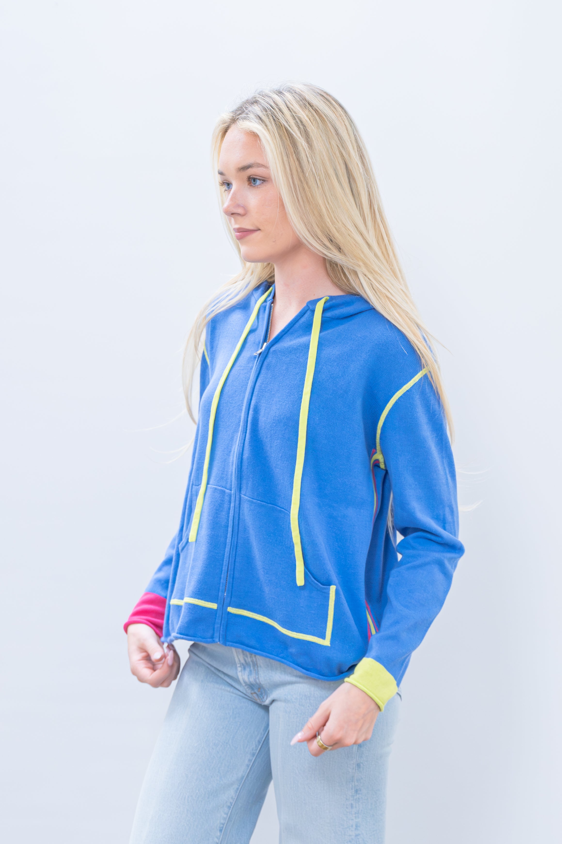 The Zaket & Plover Sports Hoodie Skyline brings vibrant summer style to your active wardrobe. Crafted in a lightweight knit, this hoodie features a striking bright blue base with cheerful yellow trim and a playful pop of pink on the sleeve cuff. Perfect for warm-weather layering, workouts, or casual outings, it combines breathable comfort with eye-catching color blocking that stands out from the crowd.