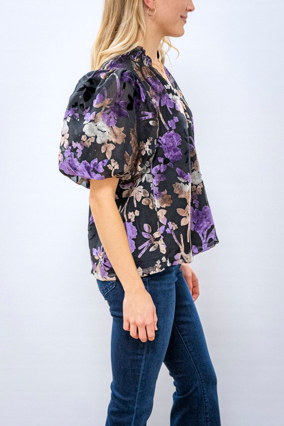Discover the perfect blouse for any occasion with our THML Puff Sleeve Burnout Blouse. Made with blended materials for a luxurious velvet feel, this blouse features a trendy v neck and puff sleeves for added style. The multicolored floral pattern and collared design make a statement while the double lining ensures comfort. Elevate your wardrobe and stand out in this must-have piece!