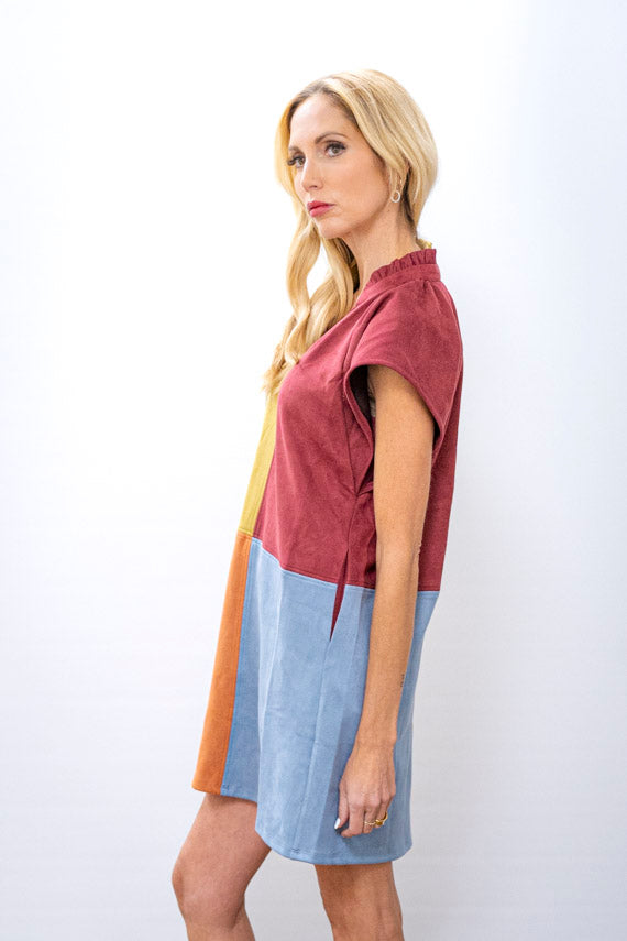 The THML Patchwork Dress combines style and comfort with its thoughtfully blended materials and flattering silhouette. This mini dress features a charming ruffled collar and elegant V-neckline that frame the face beautifully. Short sleeves keep you cool while the double-lined construction ensures confidence and durability. Perfect for casual outings or dressed-up occasions, this patchwork design adds visual interest and personality to your wardrobe. A versatile piece that transitions effortlessly from day to night.