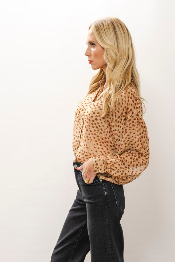 Elevate your wardrobe with the LUCY PARIS Marla Animal Top, a versatile piece that effortlessly transitions from day to night. This collared top features a striking animal print that adds instant visual interest to any outfit, while luxurious gold gemstone buttons down the front deliver a touch of sophistication and glamour. Crafted from lightweight material, it's breathable and comfortable for all-day wear, making it perfect for layering or wearing solo. Whether you're dressing up for a special occasion or keeping it casual, this statement top brings personality and polish to your look.