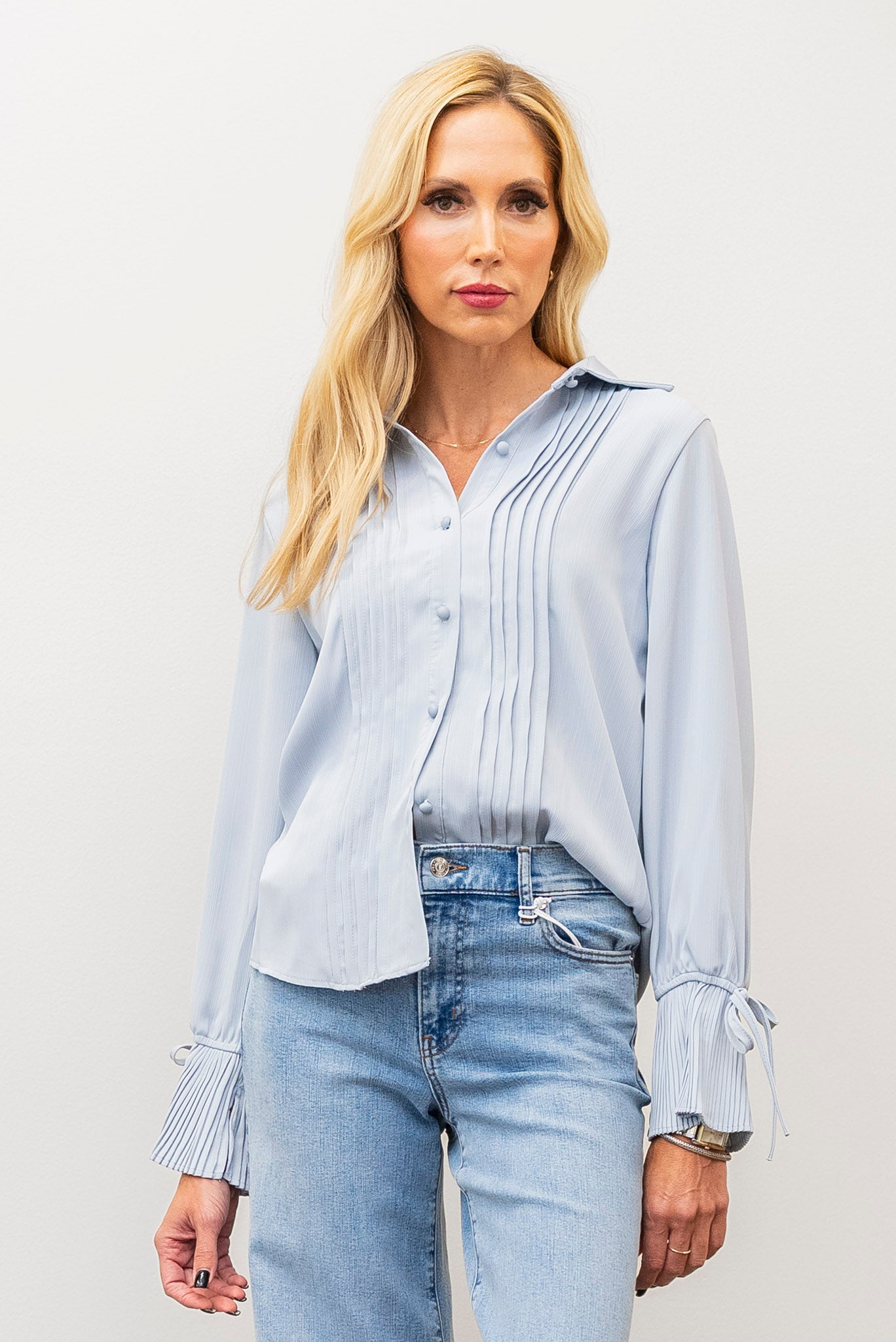 Elevate your wardrobe with the ROSIE POSIE Pleated Cuffed Button Up Blouse. Crafted from lightweight 100% polyester, it offers a graceful flow and enduring comfort. The delicate pleated design and flowy cuffs add a touch of elegance, while the classic button-front and collared neck provide versatile style perfect for any occasion. Stay effortlessly chic and comfortable all day long.