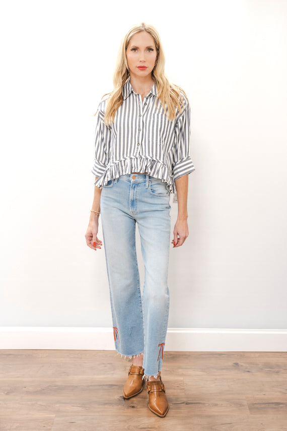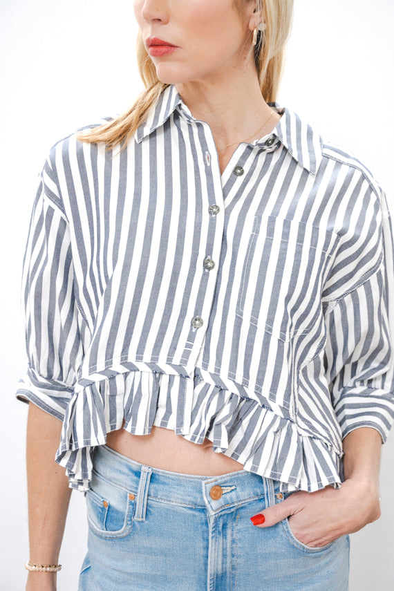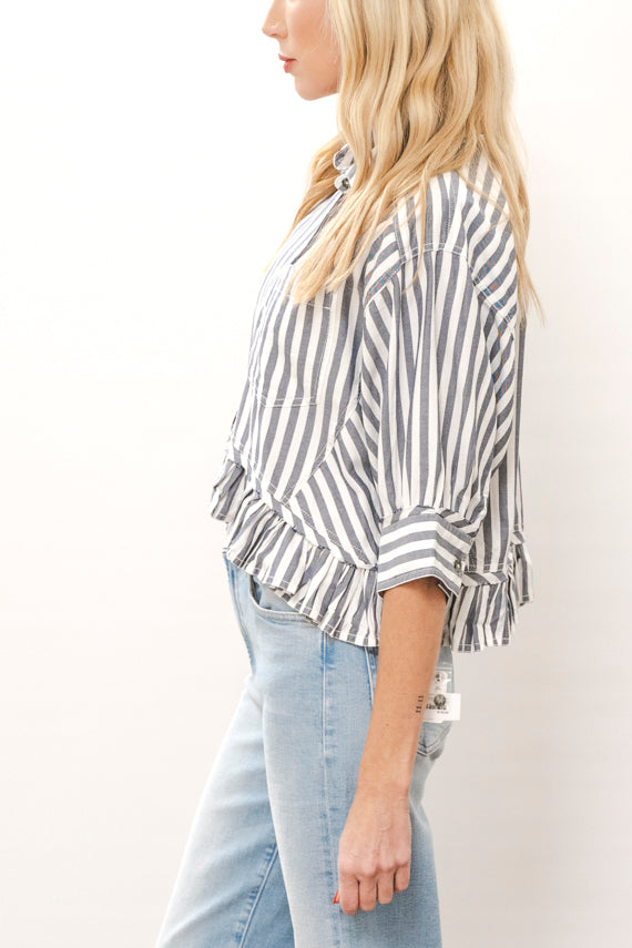Elevate your everyday wardrobe with the FREE PEOPLE Bailey Stripe Shirt, a timeless piece that effortlessly transitions from casual to polished. Crafted from 100% cotton for breathable comfort, this shirt features a charming ruffled collar and button-front closure that adds personality to any look. The classic striped pattern pairs beautifully with everything in your closet, while the flattering 3/4 sleeves offer the perfect balance of coverage and style. Whether you're dressing up for brunch or keeping it relaxed on the weekend, this versatile essential delivers both comfort and sophistication.