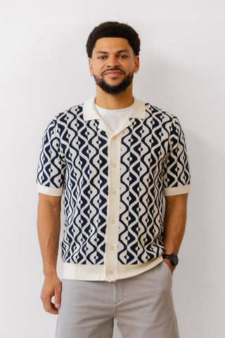 Introducing the Ben Sherman Jacquard Resort Knit Shirt - a retro knit that combines style and comfort. Featuring a classic navy and white color way, this heavy knit shirt will keep you looking cool and feeling warm. Complete with a unique camp collar button front, it's the perfect addition to your wardrobe.