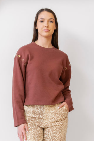 Cozy up in style with our NATION Arlem Sweatshirt. This maroon crew neck sweatshirt features a unique studded whole design that adds a touch of edginess to any outfit. And with its soft fabric, comfort is never compromised. Be effortlessly chic and comfortable in the Arlem Sweatshirt!