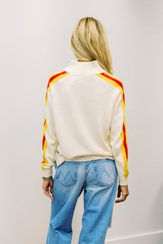 Stay warm and stylish with the PINKPINEAPPLE KC Football Quarter Zip Sweater. Crafted from 100% medium-weight cotton, it offers comfortable breathability and durability. The quarter zip front and collared neck provide a versatile look, while the bold red and yellow side stripes add a dynamic touch of team spirit. Perfect for game days or casual wear, this sweater combines classic design with everyday comfort.