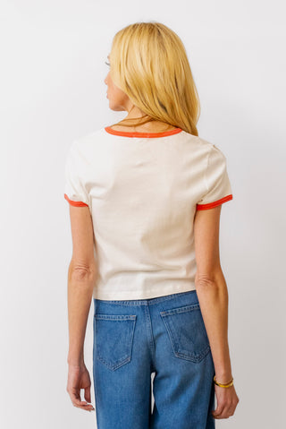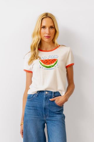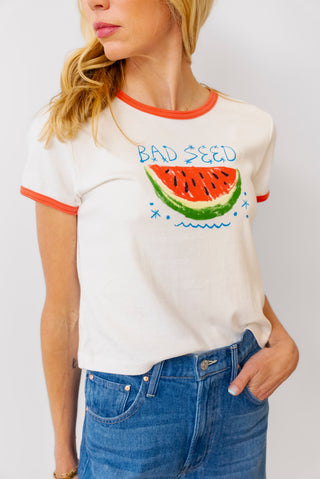 Let your little one make a big statement with the MOTHER Itty Bitty Ringer Bad Seed tee. The tiny ringer style and bold bad seed graphic add a playful touch to the classic baby tee cut. It's the perfect way to show off their personality and attitude in style!