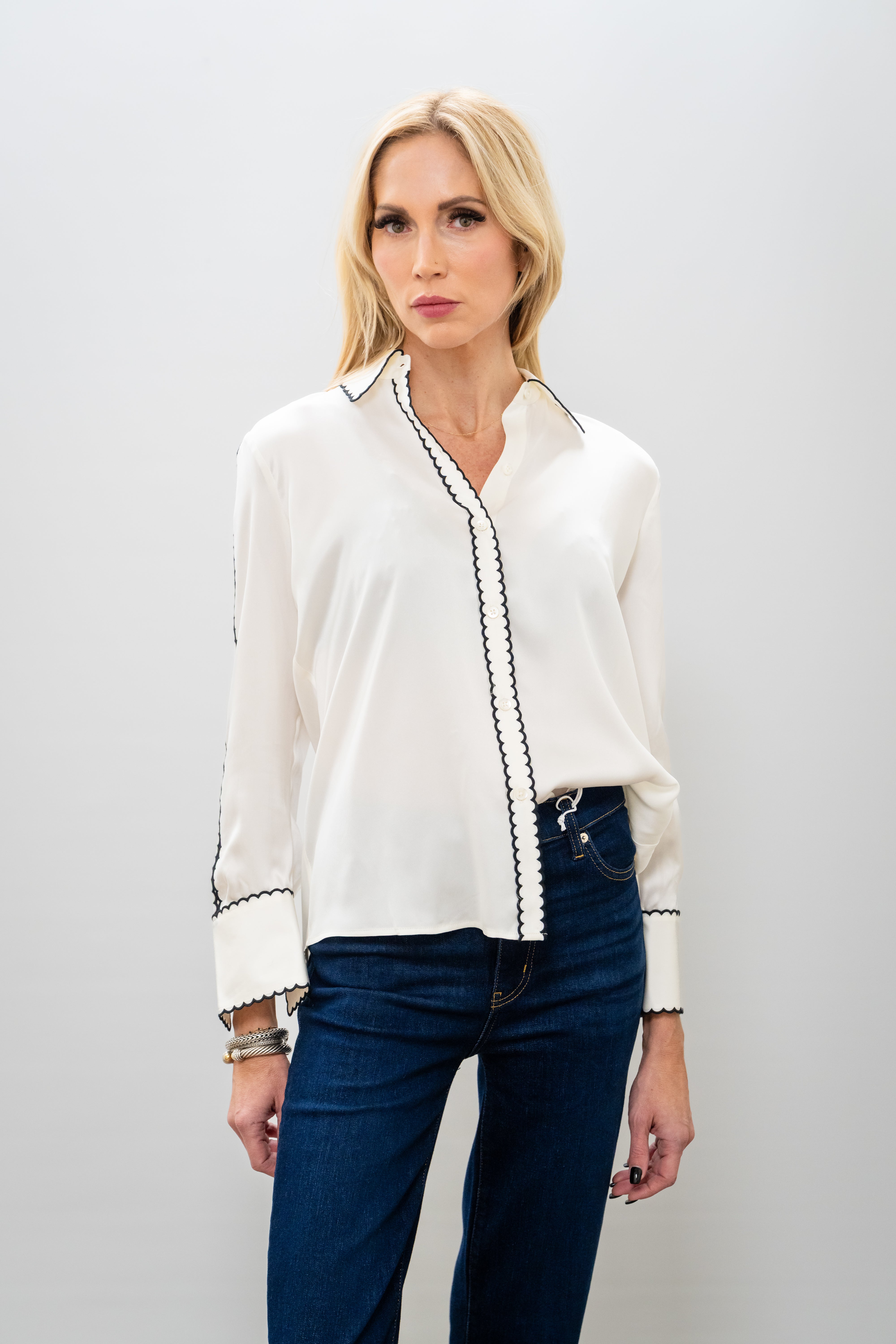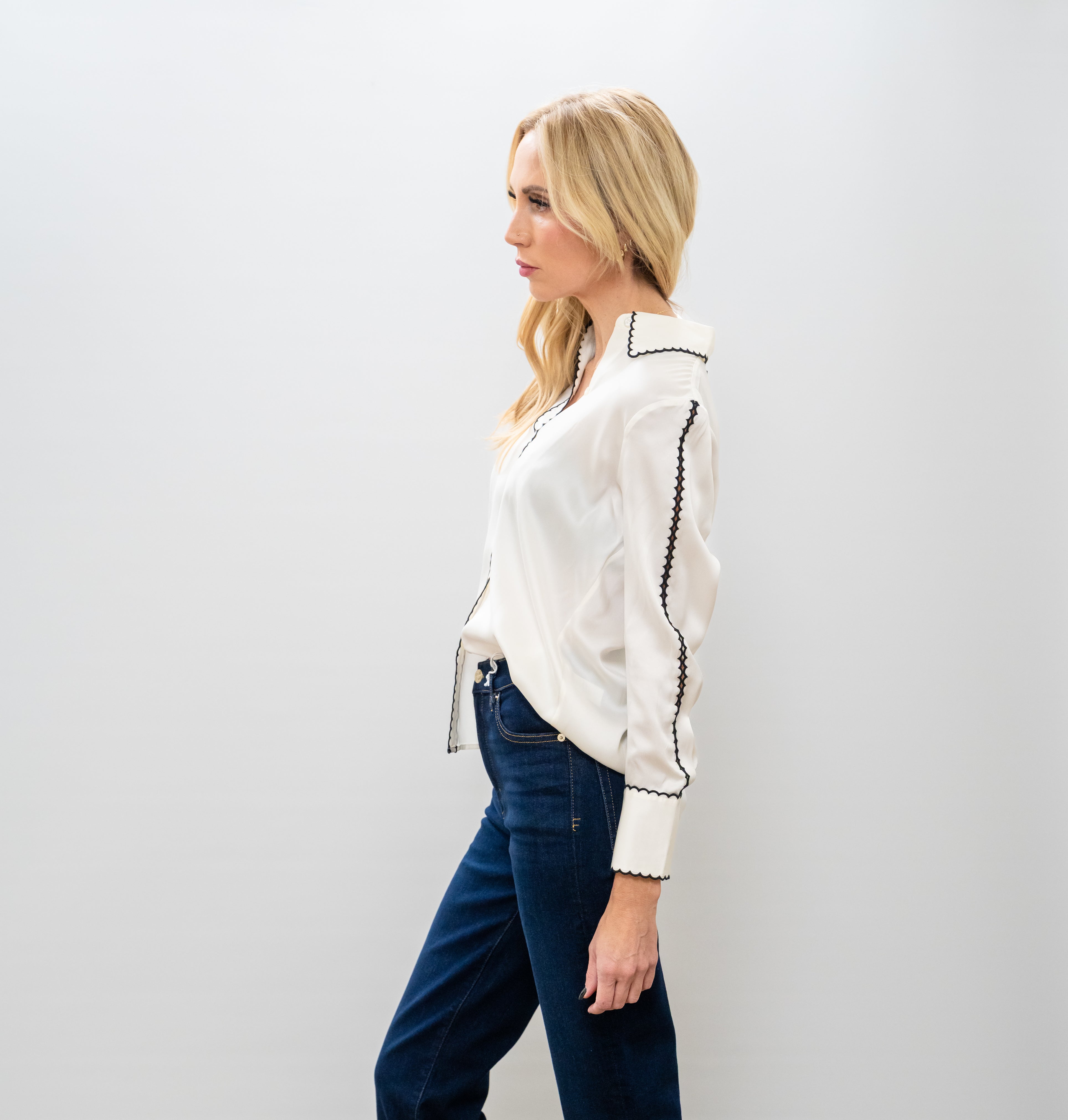 Elevate your wardrobe with the RAILS Aloise Ivory Blouse, a timeless piece crafted from luxurious 100% silk. The lightweight fabric drapes beautifully while maintaining its shape, making it ideal for both professional settings and weekend outings. Featuring a crisp collared neckline, button-front closure, and long sleeves, this blouse offers refined sophistication. Distinctive black lining decals add a subtle design detail that sets it apart. Invest in quality that feels as good as it looks.